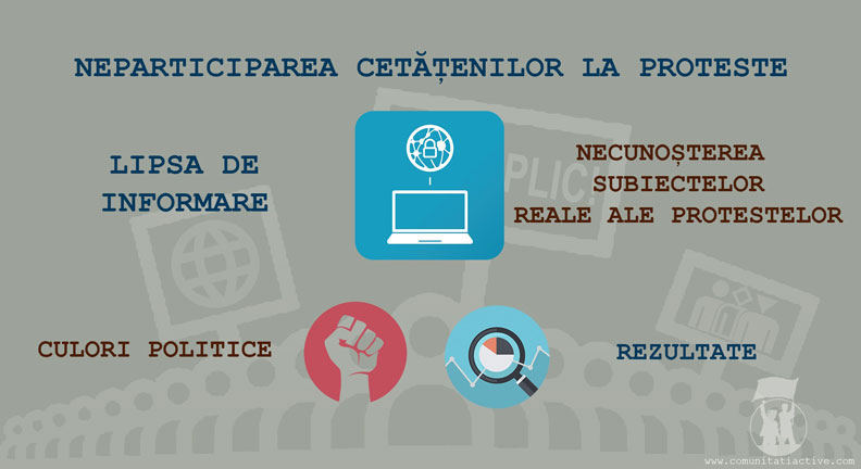 Gradul de participare a cetățenilor la protestele civice este scăzut din așa motive ca: lipsa de informare, necunoașterea subiectelor reale ale protestelor, percepția că protestele sunt organizate de o entitate politică, credința că participarea lor nu va da rezultate.